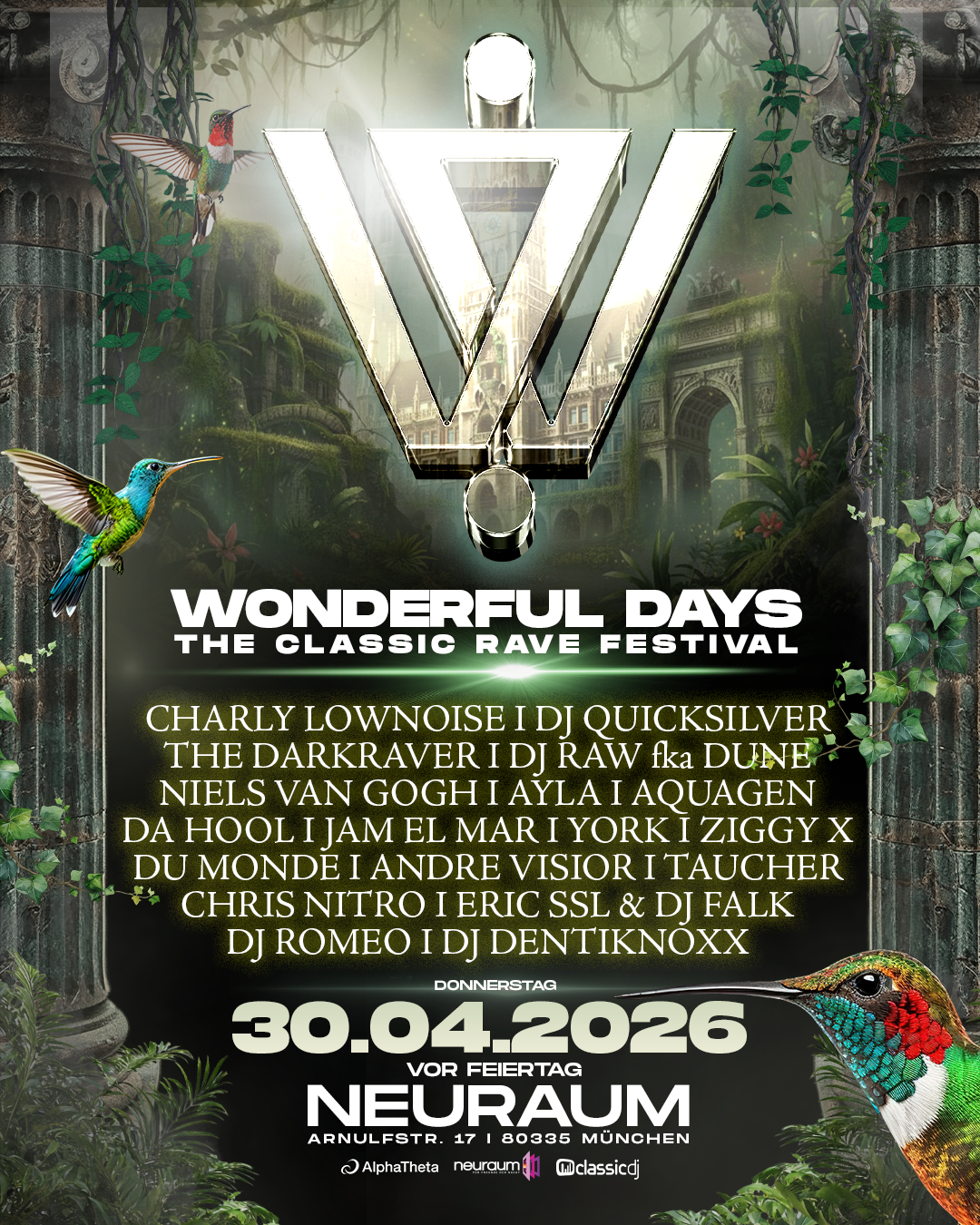 Am Donnersag, den 30. April 2026, kommt Wonderful Days – The Classic Rave Festival erstmals nach München und verwandelt den legendären Neuraum in einen Treffpunkt für Raver, Clubgänger und Liebhaber des echten Oldschool-Sounds.